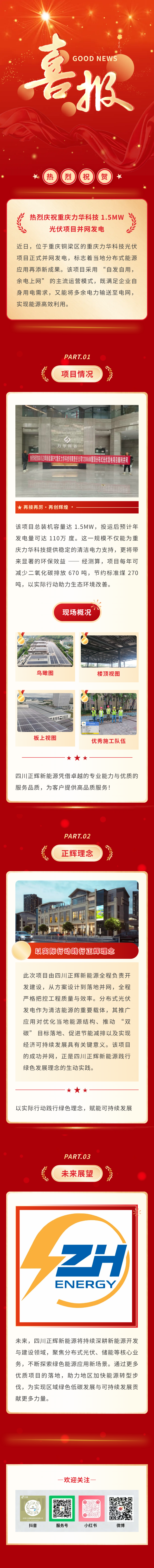 1.5MW光伏項目在重慶力華科技并網發電,正輝再添綠色新動能